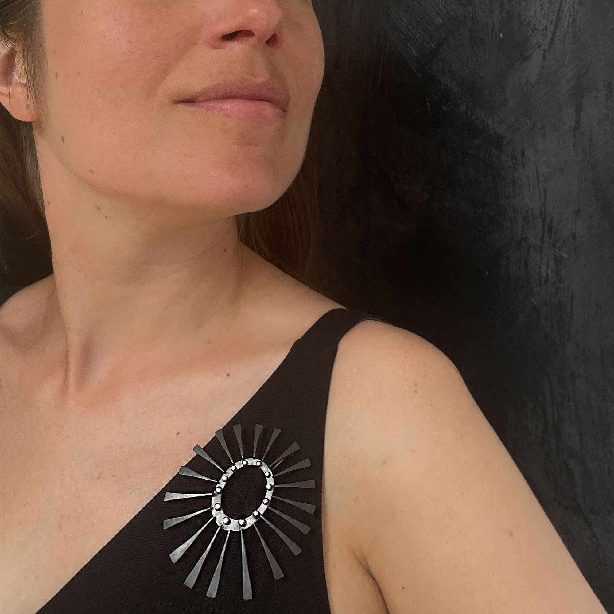 Striking graphic brooch in ruthenium plated silver with diamonds. Inspired by street art and animation, this piece works really well on black as well as on lighter colours.