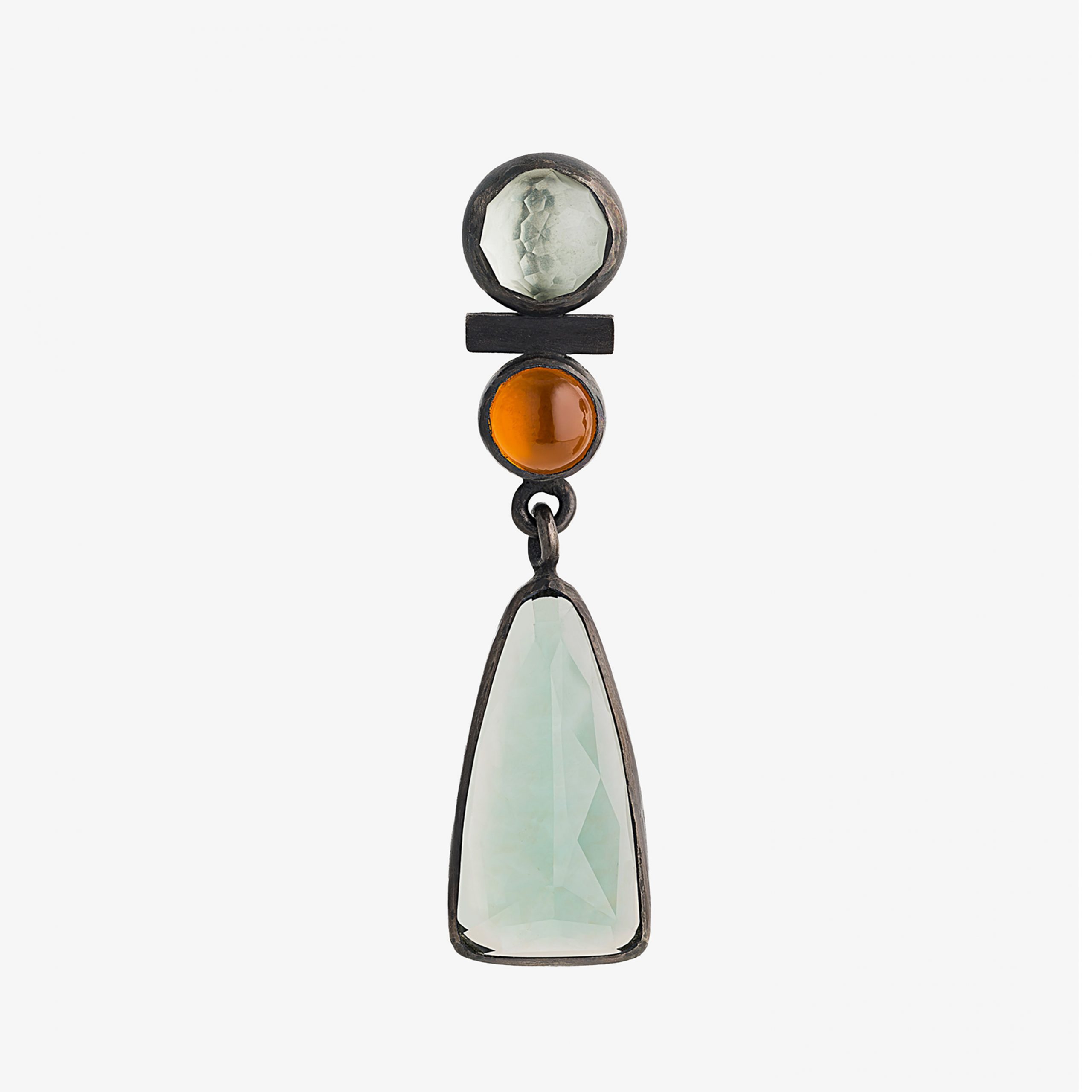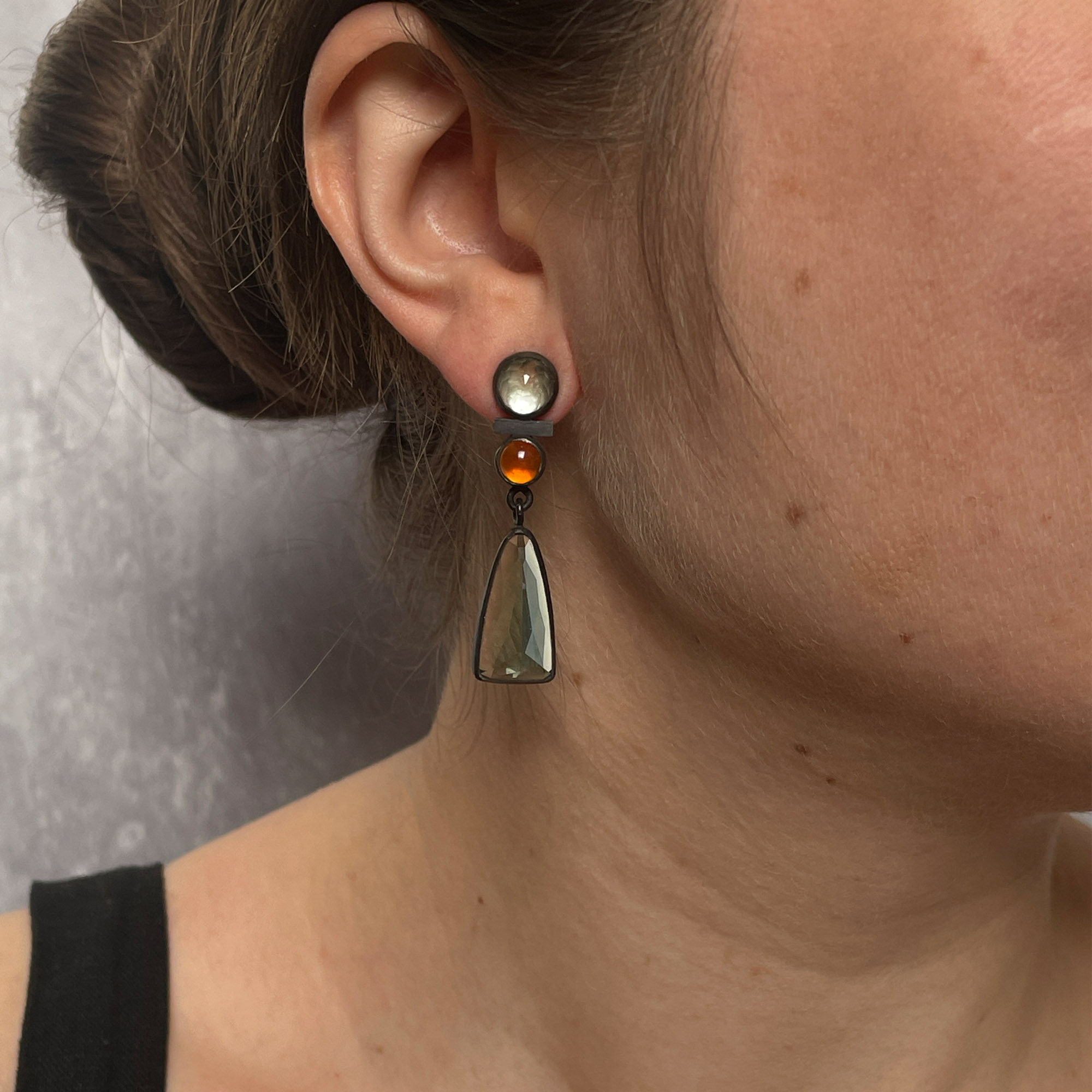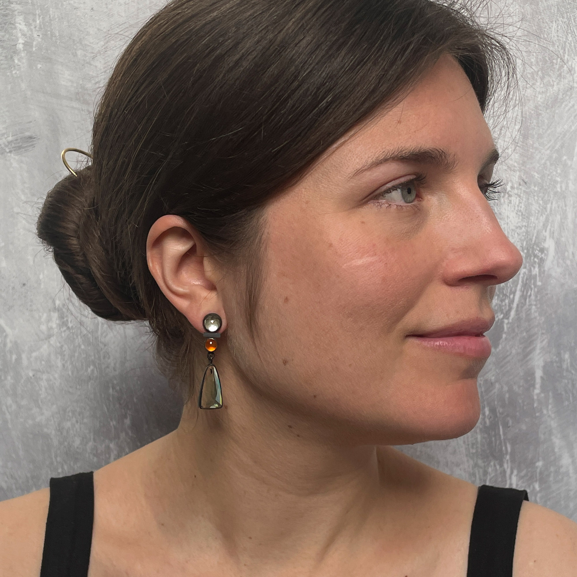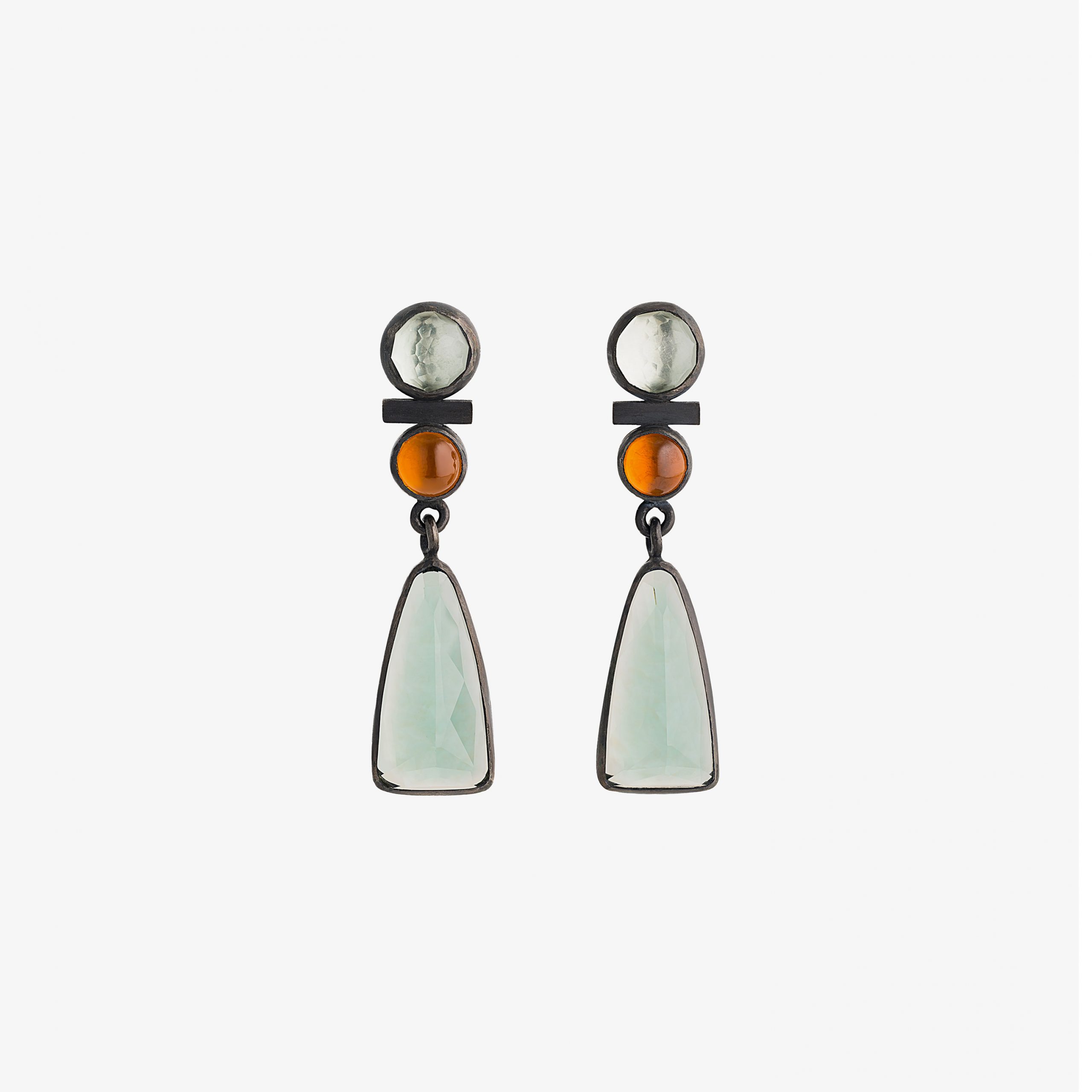 Earrings in oxidised silver, with citrine cabochons and green amethysts. Striking but subtle colours, the beautifully faceted stones make these a very special pair.