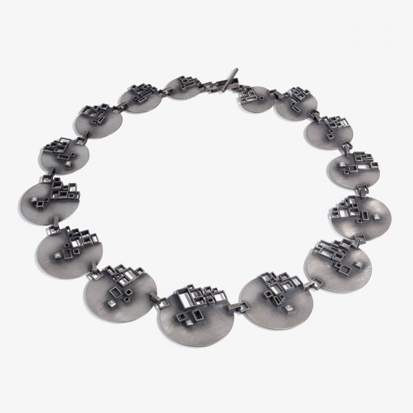 Graduated necklace in lightly oxidised silver with nine 2mm princess cut diamonds, which give a discreet occasional sparkle. Made up of 15 flat discs, the ‘grid’ sections are inspired by aerial views of Greek and Middle Eastern villages. This piece will work with many colours and is comfortable and easy to wear.