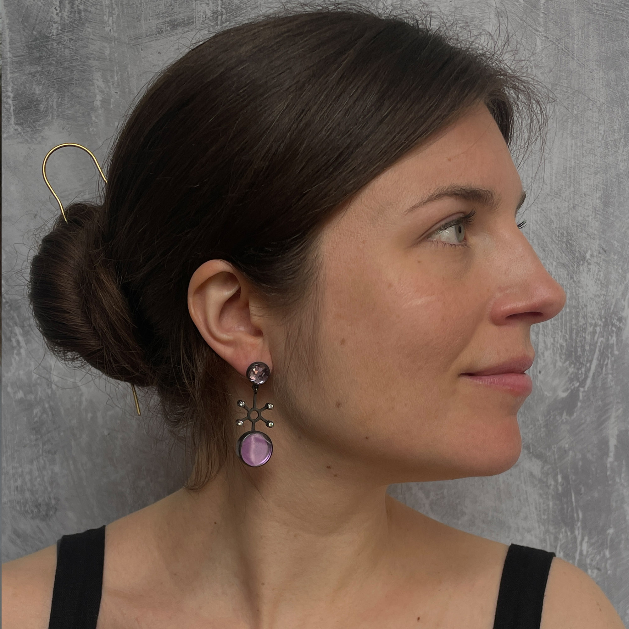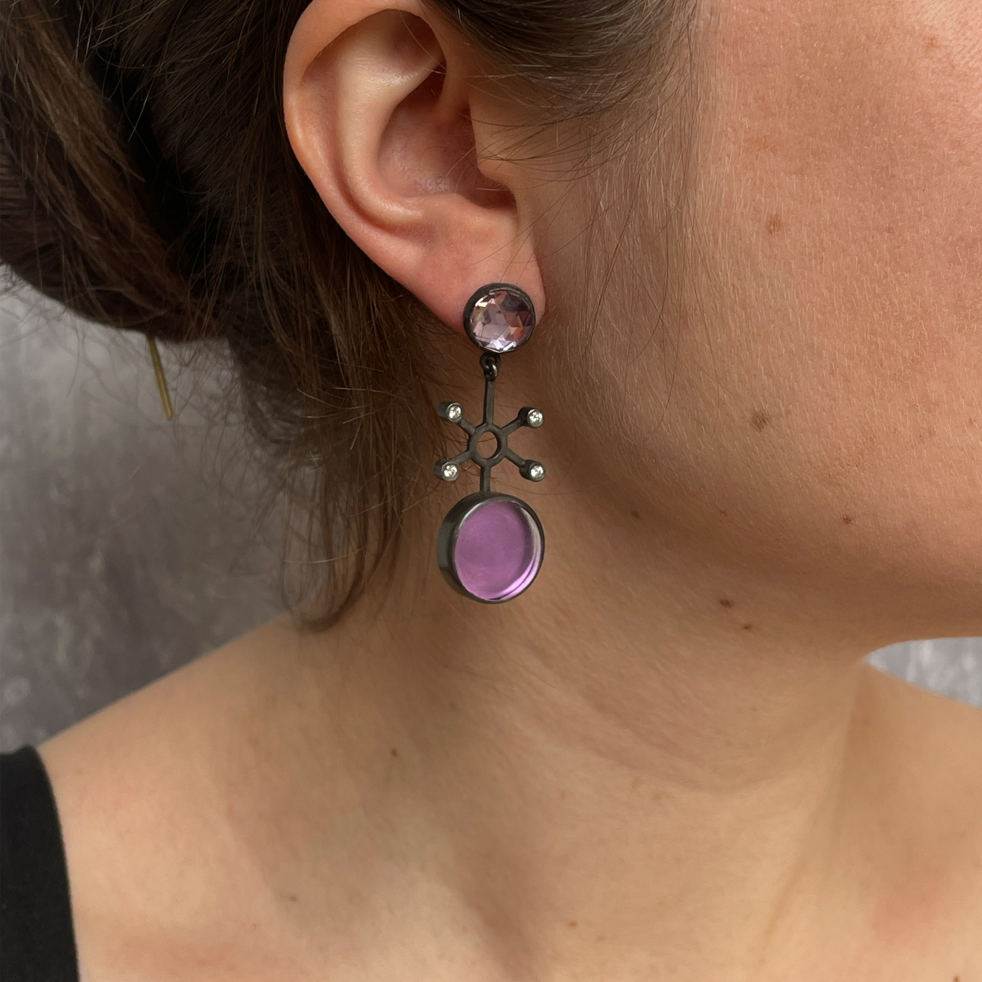 Oxidised silver earrings featuring unusually flat cut and faceted amethysts with diamonds.