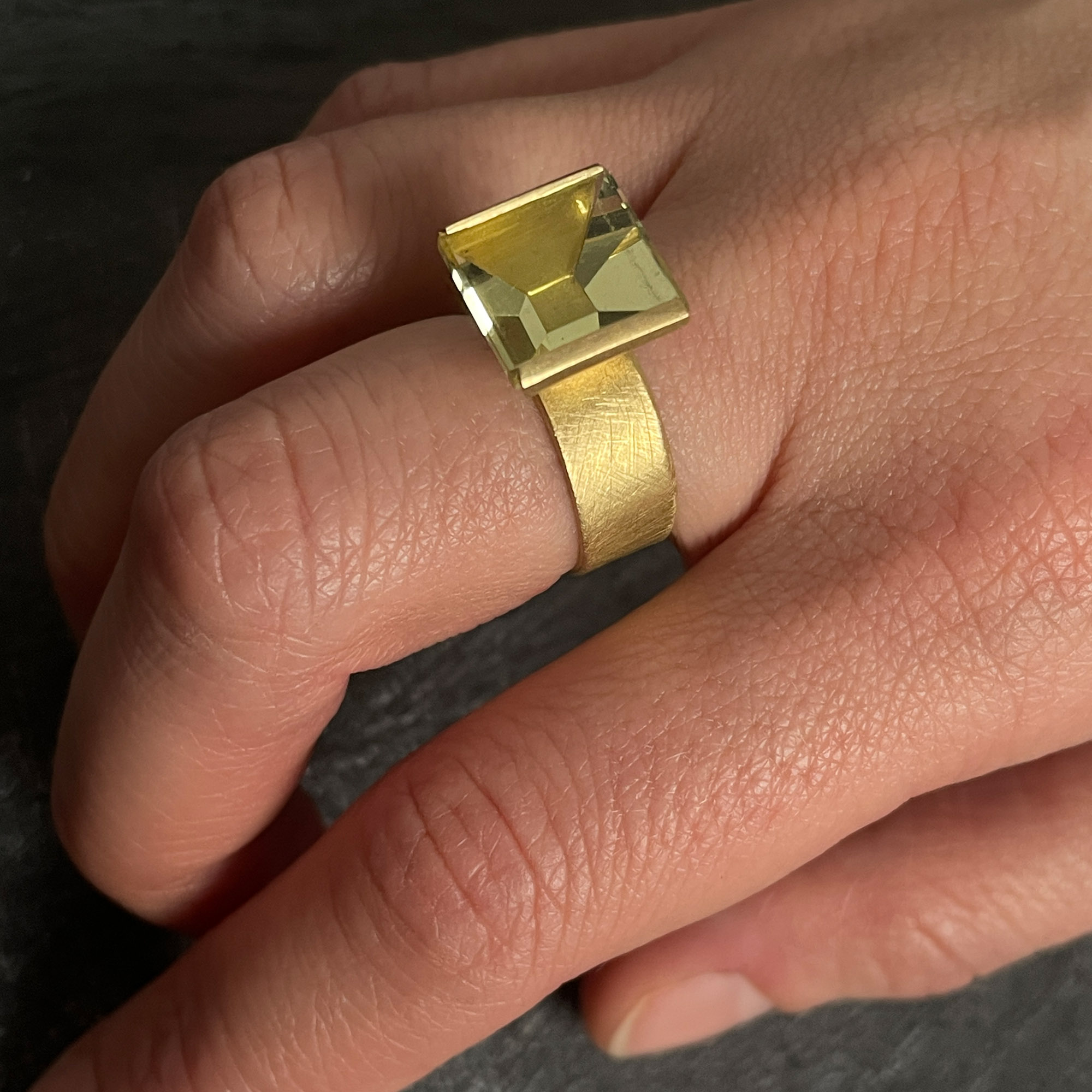 Ring in recycled 18 carat gold with a unique mirror cut lemon citrine with a small square shape at the bottom.