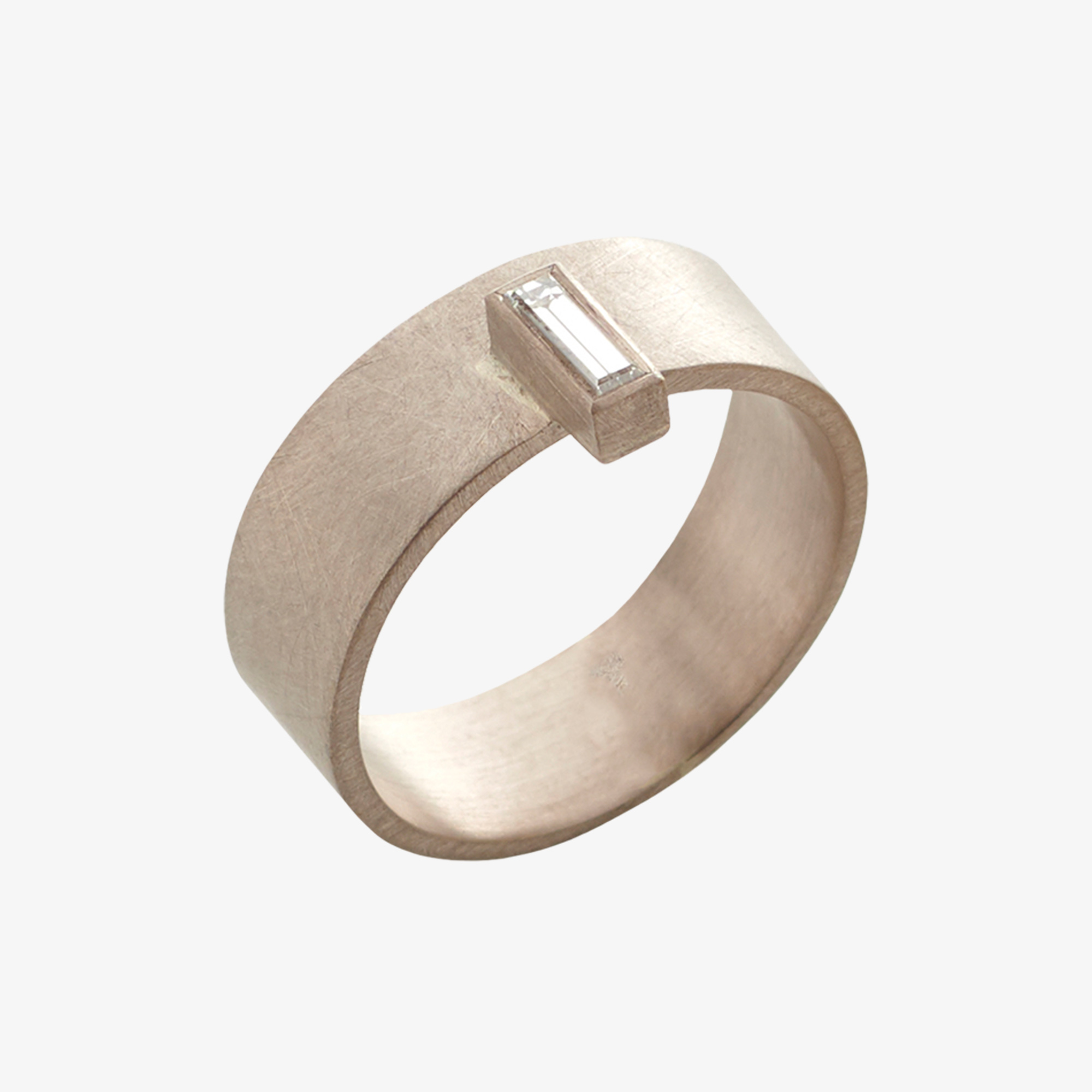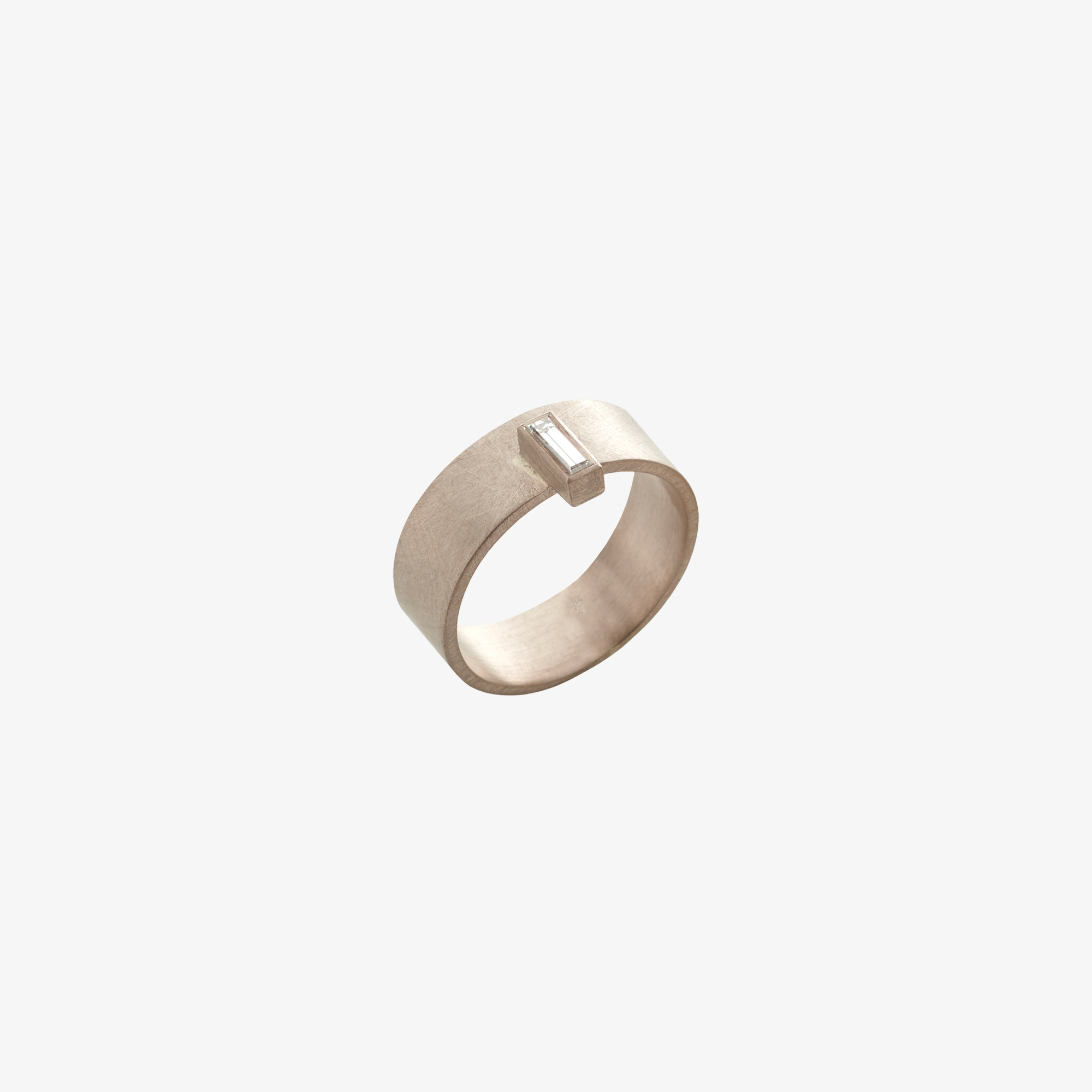 18 carat white gold band with a single diamond baguette. The ring can be stacked/worn next to a plain gold band.