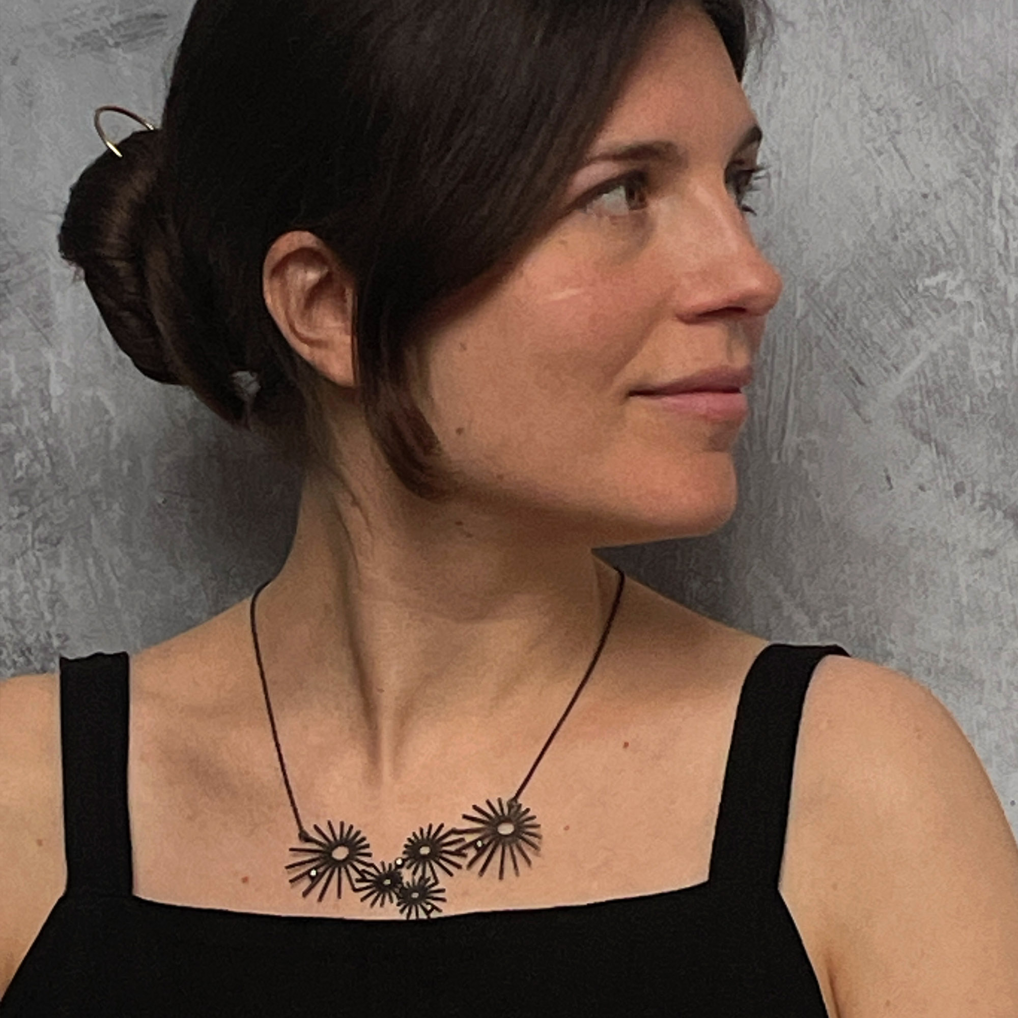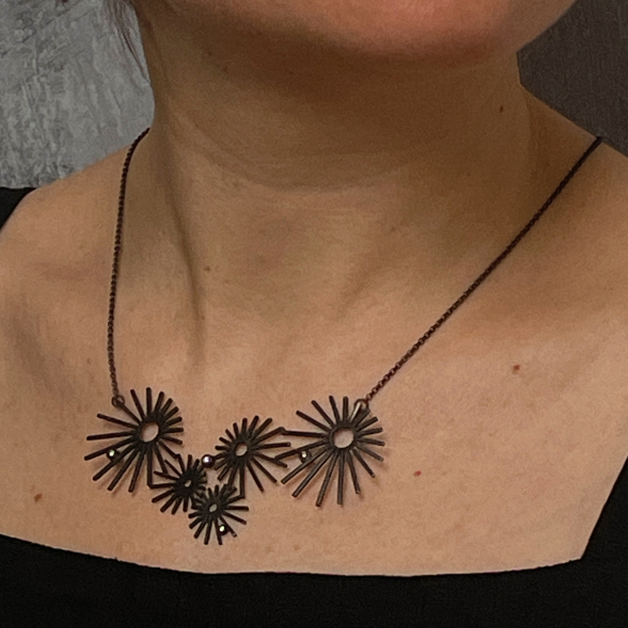 A playful graphic necklace designed to be noticed, in oxidised silver with four 2mm diamonds on a chain.